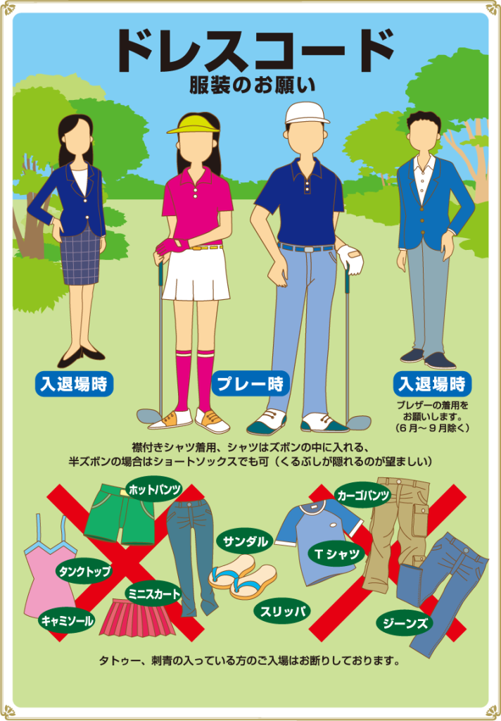 • 襟付きシャツを原則とし、ハイネックシャツは認めますが、Tシャツ、タンクトップ、キャミソールでのご来場およびプレーをお断りいたします。